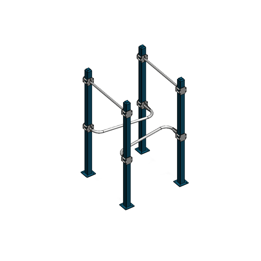 A square, four-post exercise system featuring 42-inch parallel bars and two 84-inch high straight pull-up bars.